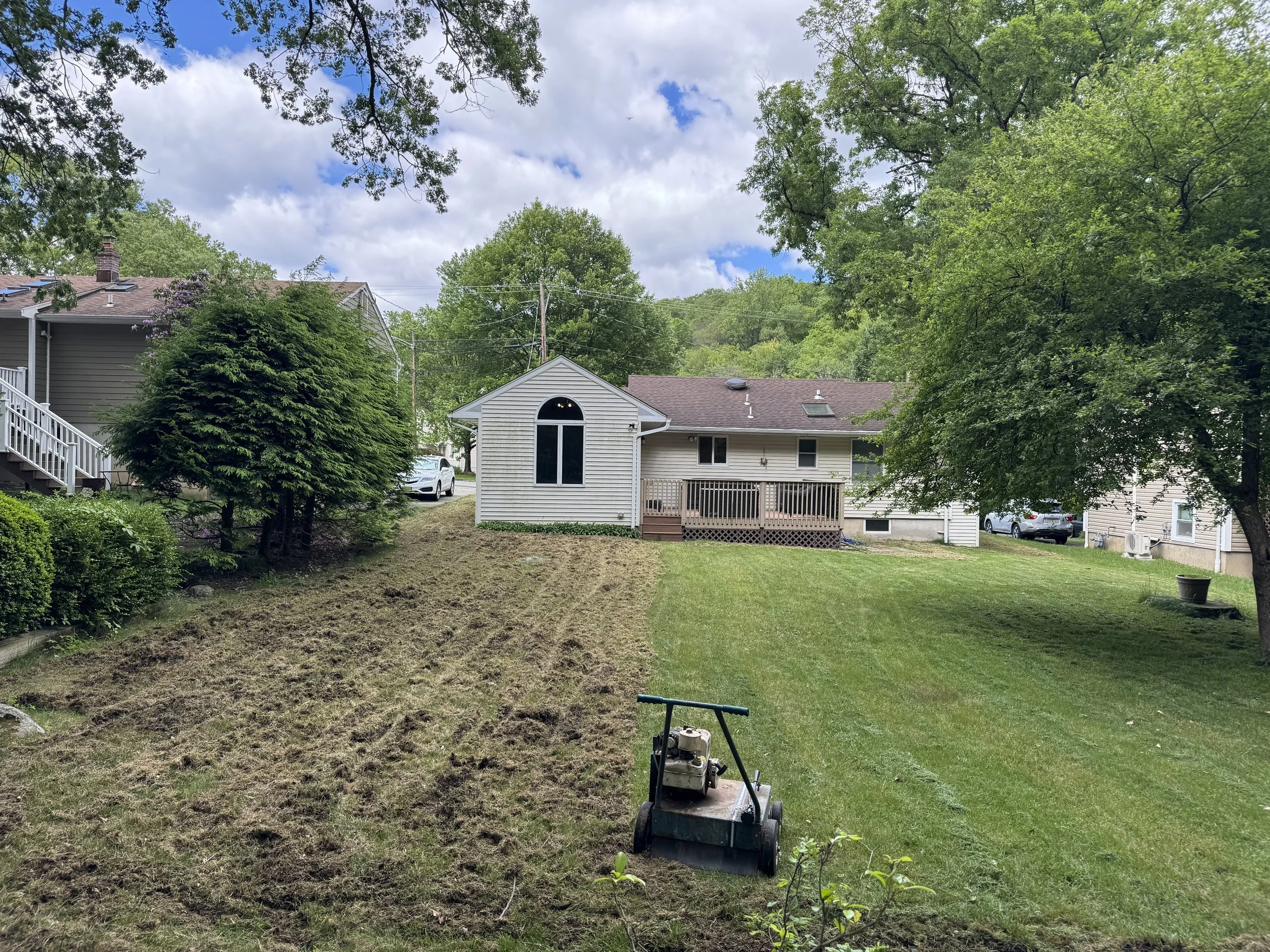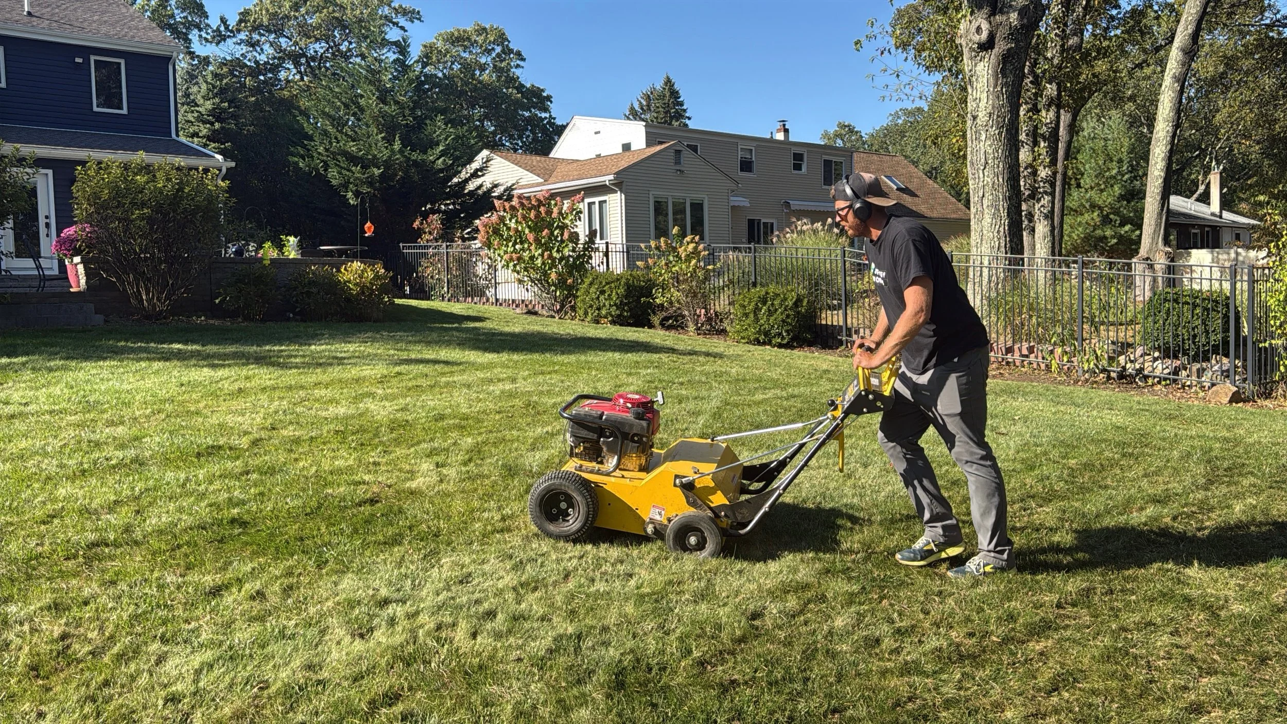 Excess thatch is removed to improve soil contact and airflow.